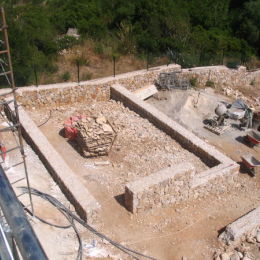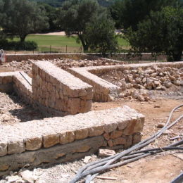 The front and rear garden of a contemporary, newly-built house in Majorca, overlooking a golf course in the north of the island. The images show the building work in progress, particularly the construction of the local stone retaining walls of the steeply sloping garden.