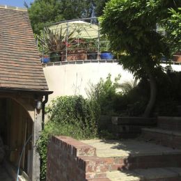 An outside seating area was needed at the front of a steeply sloping front entrance, with a connection to a storage area above a new oak garage.